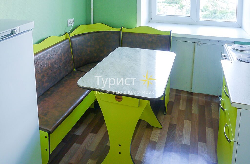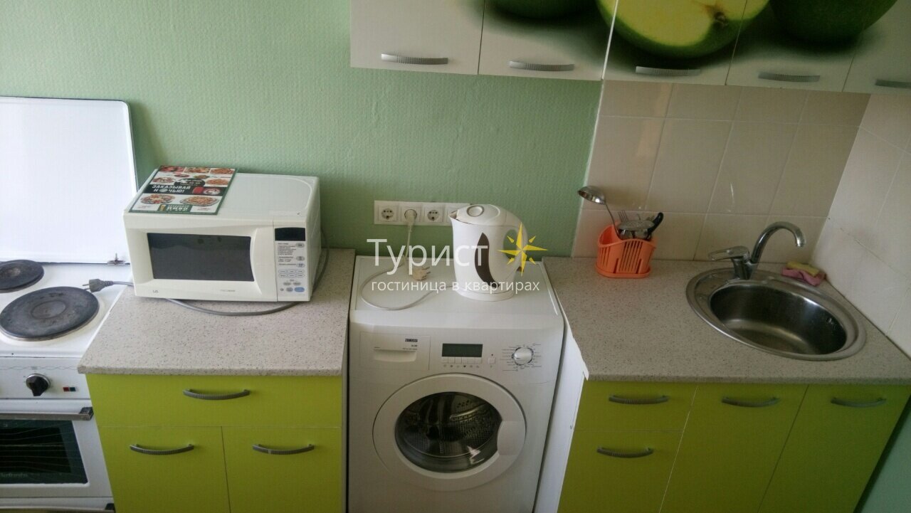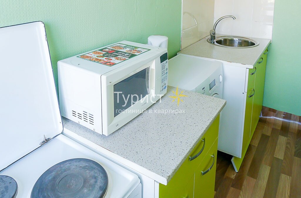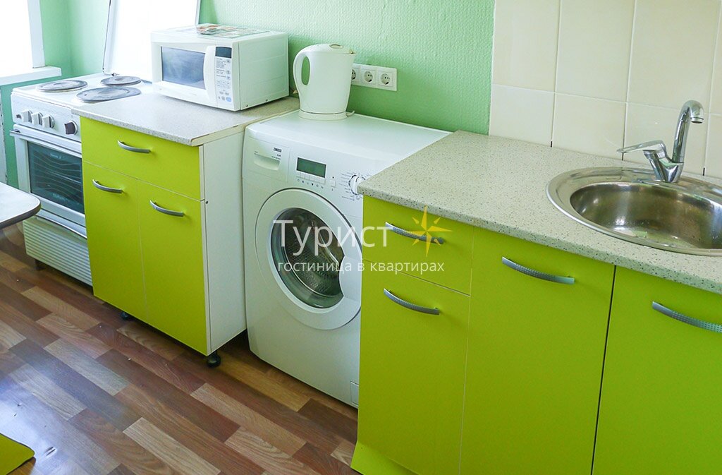 Кухня оформлена в ярком салатовом цвете и насчитывает все главные атрибуты, необходимые для готовки и приема пищи – шкафы и рабочие поверхности с посудой и столовыми приборами, электропечь, мягкий уголок, электрочайник, холодильник и печь СВЧ. Санузел совмещенный, но достаточно просторный и эргономично оформлен новой сантехникой и стиральной машиной.