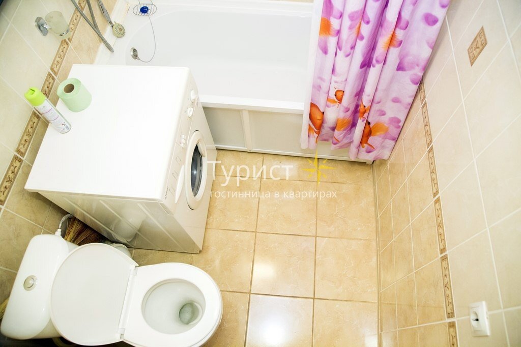 Мягкий уголок позволит расслабиться перед телевизором, а удобная кровать – выспаться перед напряженным или активным днем. Кухня обустроена столами и шкафами, укомплектованными столовыми приборами, столом для принятия пищи, окруженным диванчиками, холодильником для хранения еды и напитков, а также микроволновой печью. Санузел довольно просторный, хотя и совмещенный, оснащен машиной автомат, а также полотенцами для каждого гостя. С балкона открывается ландшафтный вид на город.